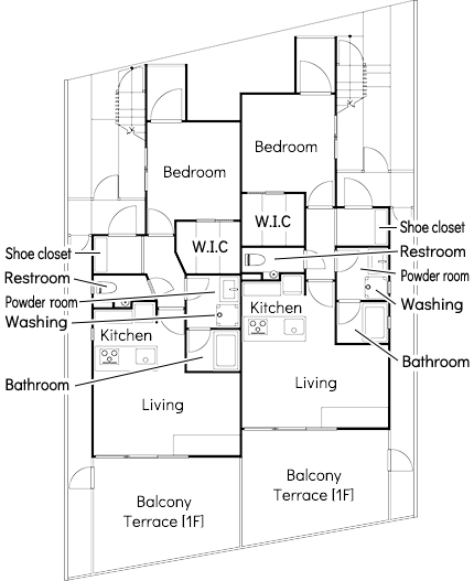 Forest Court ASAGAYAの寝室は優しい光の差す北側を利用し、ベッドヘッド側壁と天井をBlueにその他をWhiteで纏めたBlue&Whiteの清涼感を楽しむ空間です。1Fバルコニーは壁面に掛かる「額縁の中の絵」に見立てたデザイン。2Fはバルコニー床に焦茶のウッドデッキを採用し、それを手摺の白い曇りガラスと白の窓枠が挟み込むアンサンブルを形成し上質感を醸成します。美しいスッキリ空間を創るためエアコンも出入口上部に完全にビルトインされています。またベッドフット側壁を上から照らす壁面間接照明(調光機能付)、天井に埋込まれた4個のダウンライト(調光機能付)を屈指するとホテル・ライクな寝室シーンを演出できます。ベッドヘッド側壁幅は3.04mあり、最大で幅2.1-2.2mのWide Kingサイズのベッドに対応、ご夫婦プラス幼児一人まで寝ることができます。
